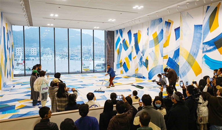 昨天,由著名建筑师、普利兹克建筑奖得主王澍教授亲自操刀设计的舟山市(普陀区)美术馆正式开馆。该馆通过与旅游、教育、科技等领域的深度融合,导入书店、轻食、咖啡等配套业态,进一步推动文化产业融合发展。图为游客在观看艺术家现场创作。12月7日,舟山市(普陀区)美术馆的“共栖之舟”开馆展正式对公众开放。记者 张磊 摄