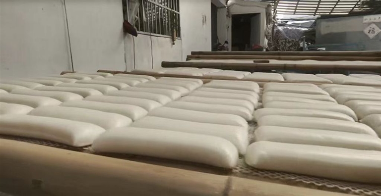 蒸熟的“年糕花”倒在面板上,师傅不紧不慢地用工具将粉团捣入机器中。流水线上便出现了长条状的年糕,旋转的刀片匀速落下,嫩白的年糕就成型了。看一眼,就能想象到它甜滋滋的味道。最后一个环节,也是最忙碌的,将切割好的年糕拿起放在竹担上,等到铺满了整整一面,就可以推到小院里去晾晒了。