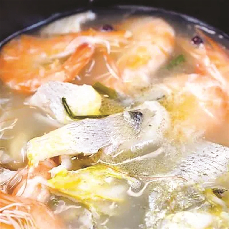 黄鱼鲞切段放入已用葱蒜爆香的砂锅,焖两三分钟后倒入温水,待锅开再放入处理过的鲜虾,“然后加水加盐,再焖一会儿,再加一次开水焖煮两三分钟就可以了。”李先生将这道菜取名为“功夫黄鱼鲞”,一上桌就获得了女儿的好评。