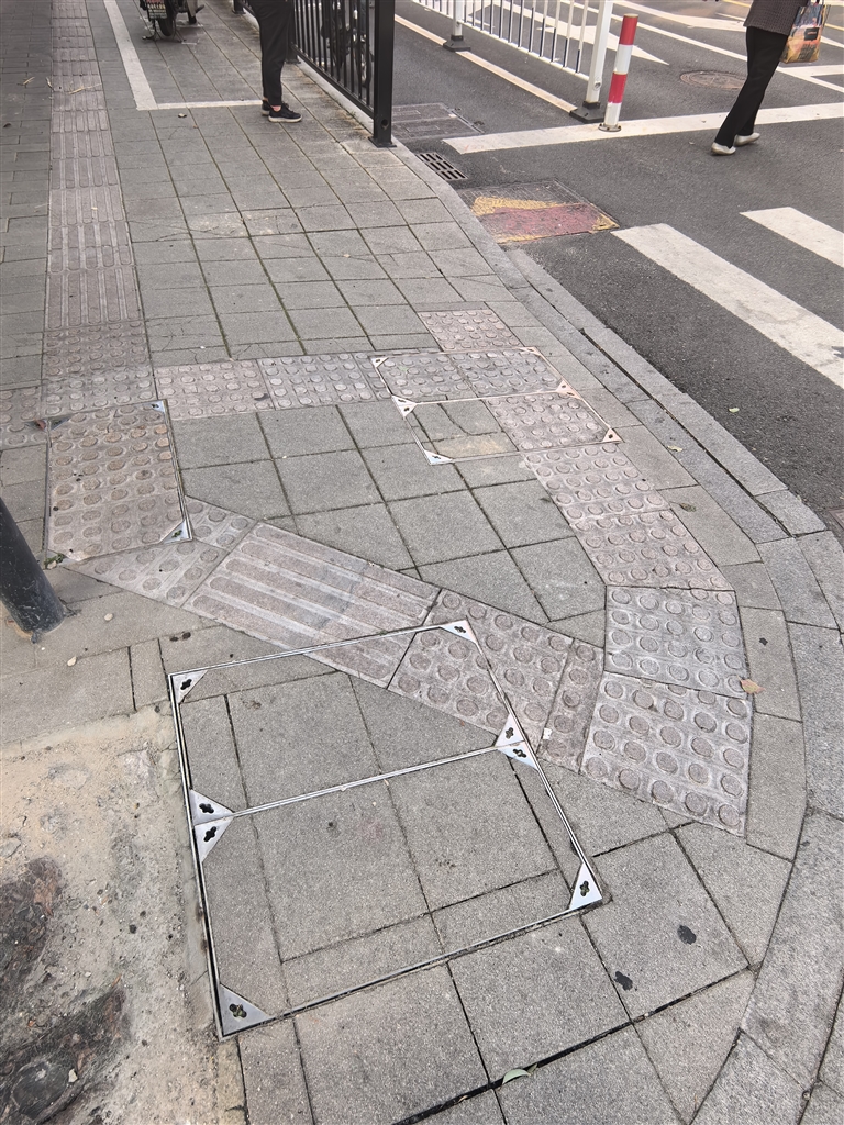 沈家门街道食品厂路红绿灯处5米左右的盲道转弯4次,还有3块“提示砖”被错铺成“引路砖”,即便是视力正常的人走下来也会觉得头昏。