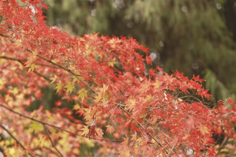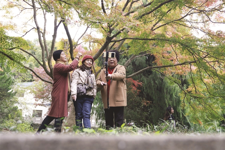 “这株鸡爪槭被我们叫作‘明星树’,每年都开得很鲜艳。”市民蒋仙菊是一名摄影爱好者,喜欢四处拍摄定海的美丽风光,每年这株鸡爪槭叶红的时候她都不会错过,“今年前后盼了20多天,天气好的时候都要来看看叶片红了没有,今天发现这株鸡爪槭顶端的叶子都红了。”她喜笑颜开,连连说道,冬天的时候这一片树林变得更加美丽,与红色的飘带桥相呼应,成为一道独特的风景线。
