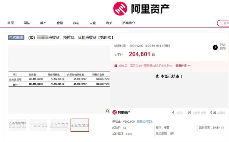 就在12月3日,同样类似的拍品,“舟山某集团公司应收款、预付款、其他应收款”合计1.6亿元债权,也是以1元的价格起拍。这次拍卖,有4人报名,经过了1011次竞价,最终以26.48万元的价格成交。