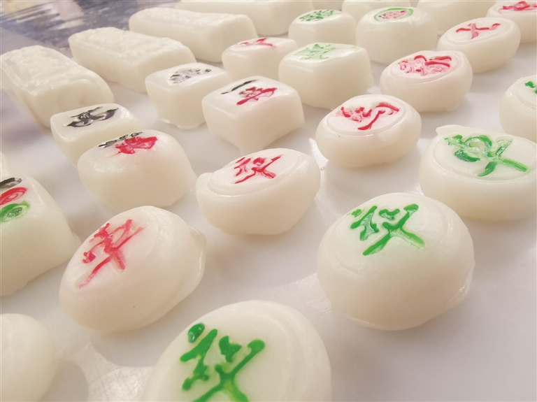 一根小小的年糕,也可以创意无限,或者压成普通的水磨长条年糕,或者发挥想象做成麻将或是象棋类小年糕。更多的时间,还是用在给年糕涂红描花上,笔尖蘸上食用色素,一笔一笔描上去,一旦成品,成就感爆棚。