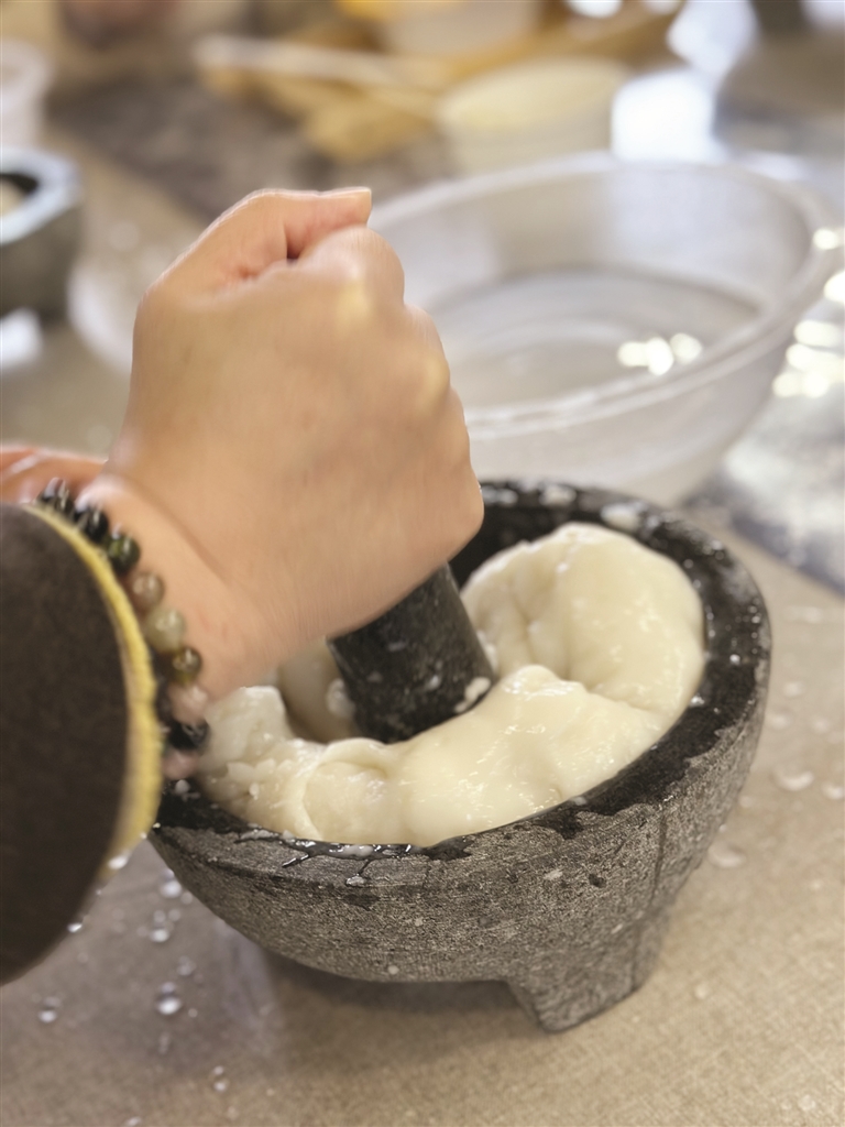 “以前这种传统的搡打雪花团都是两个人配合,一个举着锤子往下打,一个在锤打完一次后赶紧把雪花团翻一下,然后继续锤,继续翻。”侯玲玲为客人们介绍,现在的缩小版做年糕,两只手就代替原先的两个人了,左手翻雪花团,右手锤打。锤打的时候,不光要有力气,也要有技巧,要锤在中间的位置,一直锤打到雪花团呈糕体状,且有黏性,就算是完成了。