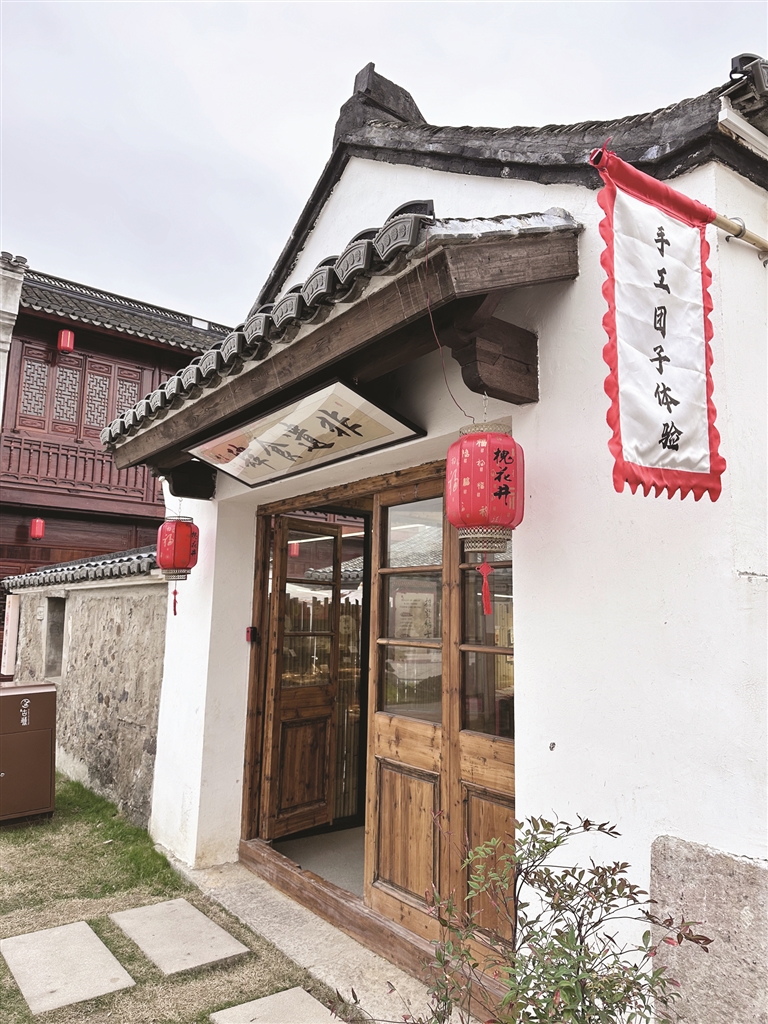 定海古城,靠近南端的老宅,门前挂着“槐花井”的灯笼,几面旗子飘飘:非遗传承水磨年糕、网红葱塌年糕、手工团子体验。
