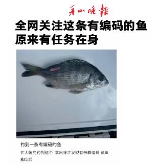 最近,台州网友在大陈岛钓到一条“有编码”的黑鲷鱼,背鳍末端处挂着一个粉红色的标签,上面写着“浙海研C50”。图片在社交圈一发布,就引发热议,评论更是精彩,“钓到了一条带编制的鱼。”“吃完了,写一篇吃后感给浙海研就行了。”还有网友感叹“钓鱼佬真是什么都能钓到”……