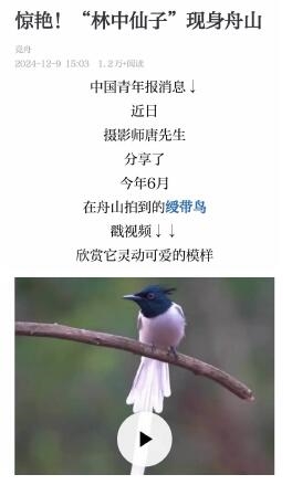 近日,摄影师唐先生分享了今年6月在舟山拍到的绶带鸟,这是一种国家二级保护动物,素有“林中仙子”的美誉(《舟山晚报》12月10日报道)。唐先生的“艳遇”,引发了更多网友的遐想:舟山这个“鸟类乐园”还藏着多少惊喜?