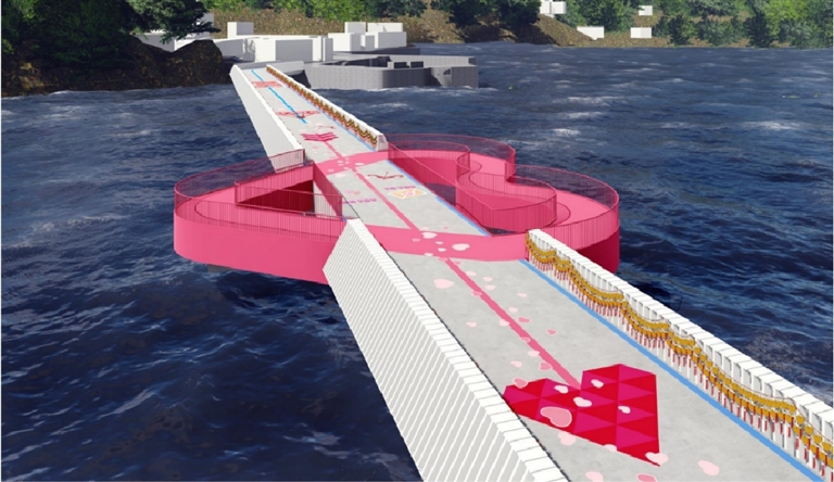 桥梁的设计参照了《小交通量农村公路工程技术标准》中的四级公路(Ⅱ类)标准,其长度为225米,宽度为6米。在改造两侧接线道路的同时,还特别布置了64.2米的爱心型景观步行道。