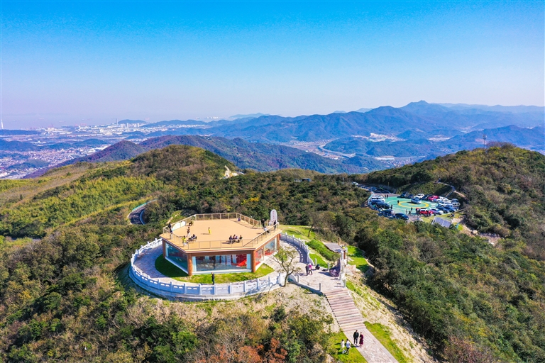 近日,定海云顶仙乡,山顶风景如画,周边茶园郁郁葱葱。市民们登高望远眺望定海古城,一步一景心情畅。记者 张磊 摄