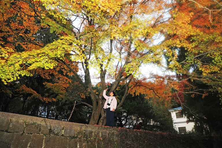 12月15日,在定海区海山公园内,一位市民正在两棵40余年的红枫树下赏景并拍摄,构成一道独特的风景。时下,这两棵红枫进入最佳观赏期,叶子逐渐变红,让人陶醉,美丽的景色吸引不少市民前来游玩。 记者 陈永建 摄