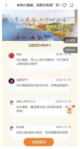 从11月15日起,市新闻传媒中心竞舟客户端推出了“@舟山晚报,我想对你说”活动,至12月15日,该活动已留下了2433条市民的殷殷话语,述说了《舟山晚报》创刊28年以来,读者与晚报的情缘、对晚报的祝愿,字字句句尽显真情。