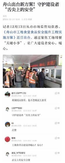 《舟山市工地食堂食品安全提升工程实施方案》于近日出台,通过聚焦工地用餐“关键小事”,让广大建设者暖身又暖心(《舟山晚报》12月14日报道)。