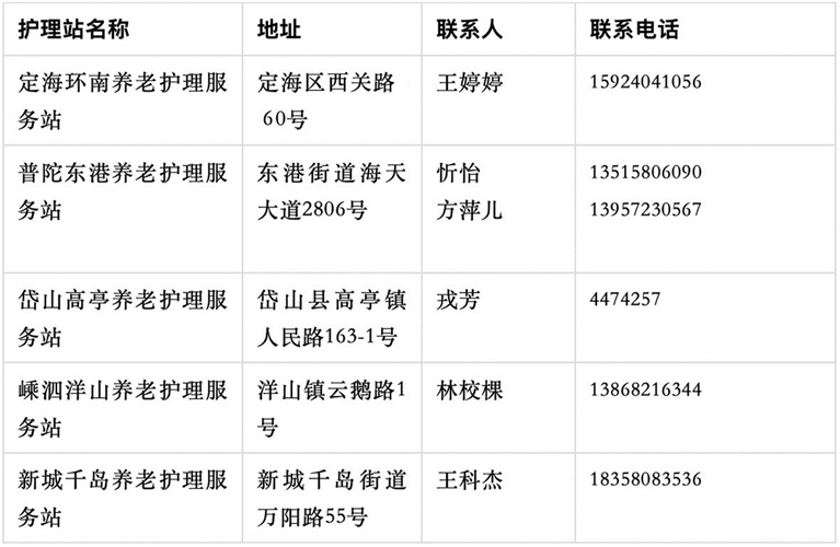 本报讯 随着人口老龄化的不断加剧,市民对养老护理服务的需求特别是居家上门服务的需求愈发迫切。截至目前,舟山已建成5家养老护理服务站(见下图)。