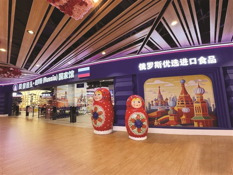 新天地购物中心负一层的“莫俄码头·俄罗斯国家馆”,招牌上明确写着“俄罗斯优选进口食品”,门前摆放着俄罗斯套娃,里面播放着俄语歌曲。