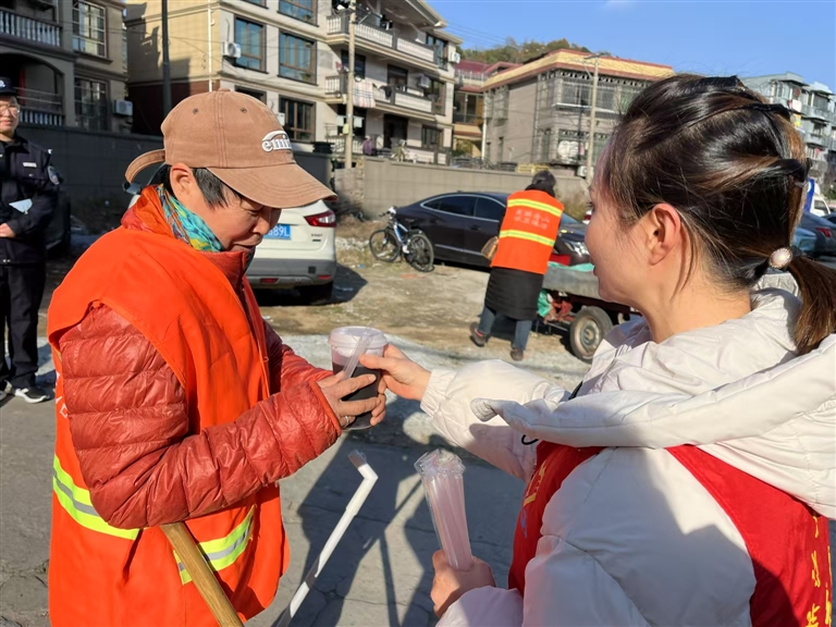 昨天下午,定海区昌国街道西管庙社区携手定海区发改局开展“暖心立冬,姜茶送暖”活动,工作人员在西管庙新村设立了姜茶供应点,向每一位路过的环卫工人和居民递上一杯热气腾腾的姜茶,同时还不忘普法宣传。