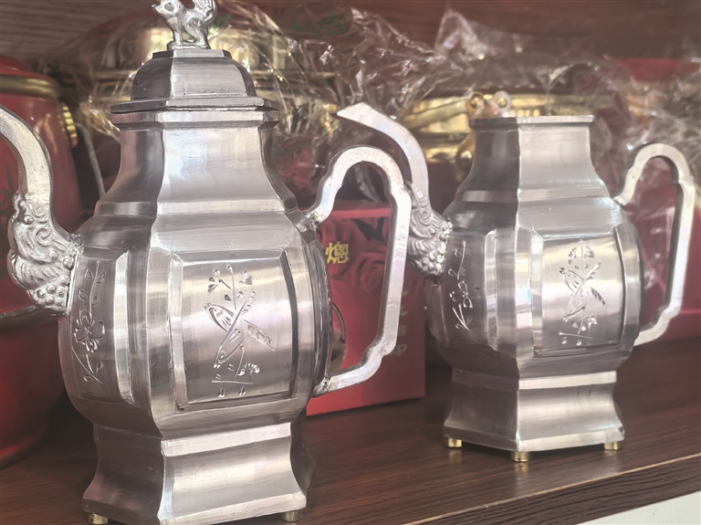 一走进店内,记者就被各式各样的锡制品吸引了,从锡壶、锡罐到锡烛台,每一件都泛着银光,透露出匠人的精湛技艺。