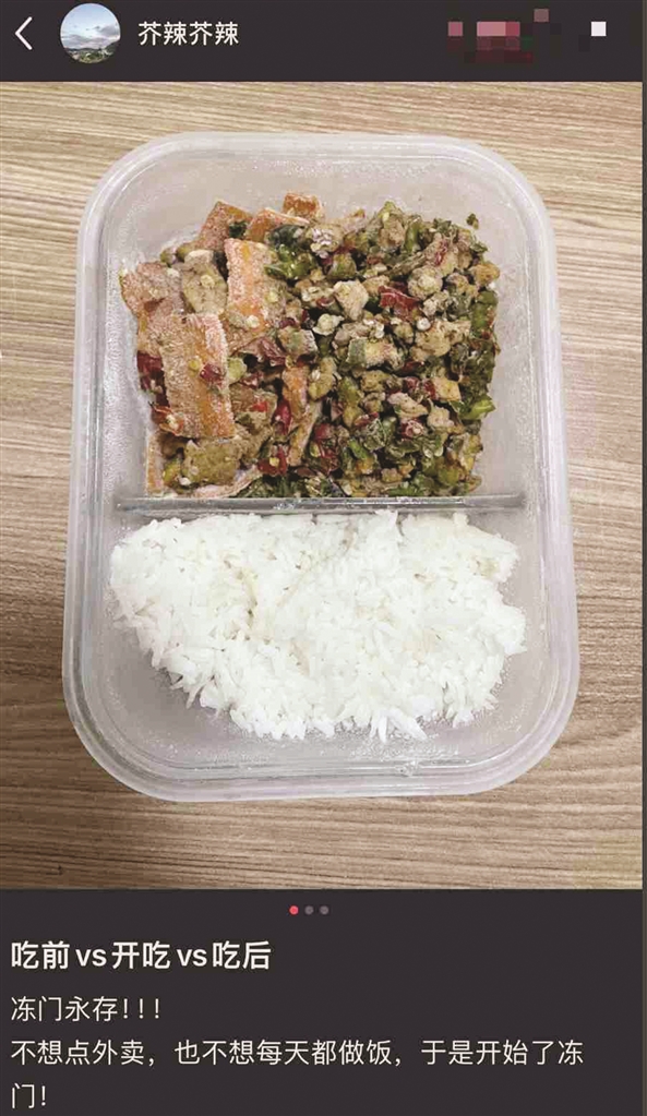 对工作节奏极快的人而言,别说吃饭,就连喝水都必须狼吞虎咽才来得及。大家自制冻菜最大的好处之一,便是能将吃饭所需的时间压缩到极致。“只有刚入职场的新人,才会以为外卖是最便捷的干饭方式。老手会在饭点前20分钟,就溜进茶水间里,把冻好的饭放进微波炉里。只需要高火叮7分钟,就能吃上热乎饭。”