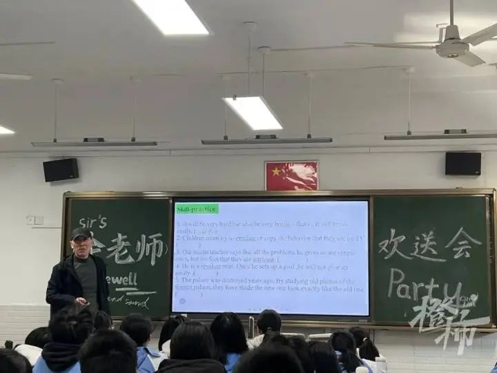 那天走进教室,他被“惊喜”到了。同学们拉响了礼花,黑板上还写着“余老师欢送会(farewell Party)”。送别一位英语老师,这主题很应景。