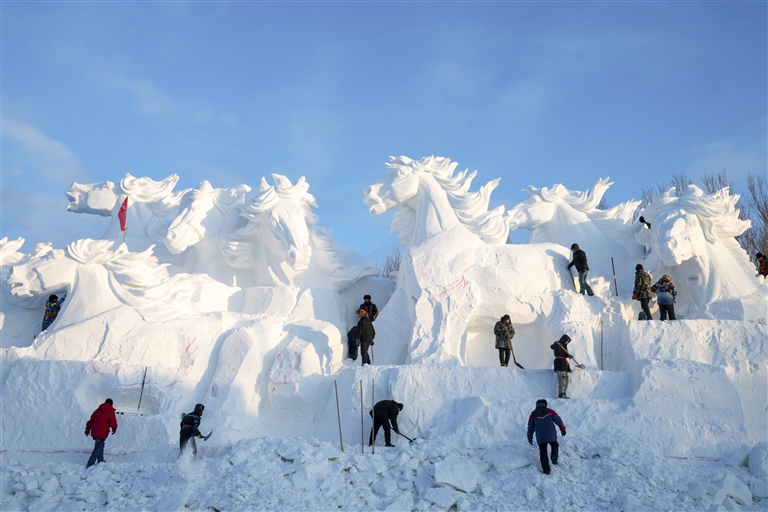 12月23日,雕刻师在哈尔滨太阳岛雪博会园区创作大型雪雕。