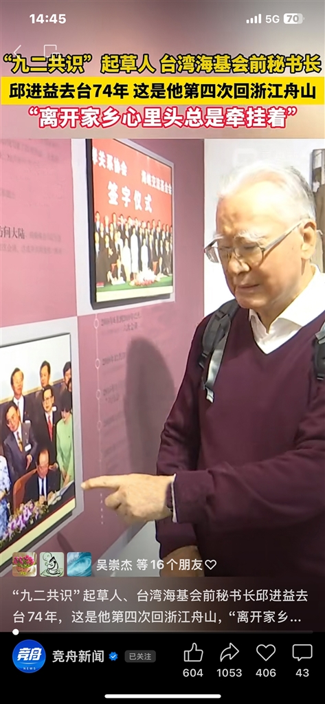 舟山籍台胞邱进益是『汪辜会谈』主要推动者、『九二共识』共同起草人,他曾四次返回舟山老家,见证着一个家族在时代潮流中的悲欢离合,亲历海峡两岸割不断的血脉之情——