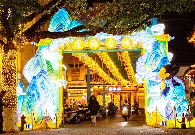 定海古城安装了7处彩灯,全部运用自贡灯会非遗手工艺。最高大醒目的莫过于放置在东城门外广场的“有凤来仪百鸟朝凤”主题彩灯。该彩灯高12米,阳光洒在凤凰羽翼上熠熠生辉。“鱼跃”主题彩灯呈现三个拱形,跨越登科桥两侧,造型别致,吸引市民打卡留念。“布置得很好看,新年氛围一下子就来了。”市民陈女士说。