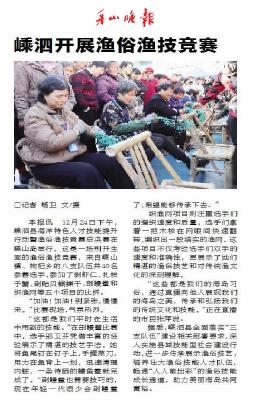 上月24日下午,嵊泗县海洋特色人才技能提升行动暨渔俗渔技竞赛总决赛在嵊山岛举行,共有40名选手参加了剥虾仁、扎梭子蟹、剖贻贝蝴蝶干、剖鳗鲞和织渔网等五个项目的比拼(《舟山晚报》上月26日报道)。精湛的渔俗渔技令人叹为观止,但看着“选手和观众多为老人”的新闻图片也让人担忧,这些承载着传统渔文化的技艺会逐渐失传吗?