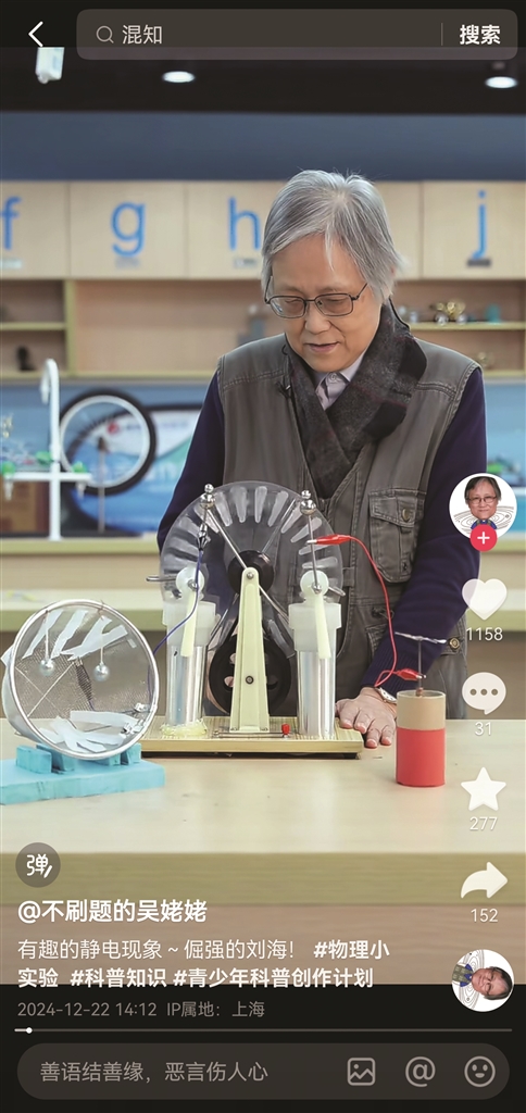 和尹松同龄的吴於人,是同济大学退休物理学教授,短视频里的她一头银发,笑起来露出两颗虎牙。她的抖音账号“不刷题的吴姥姥”拥有550万粉丝,年轻人都爱围观她做物理实验。复杂的物理学知识在她的讲解下变得生动有趣。有网友感叹:“要是早一点看吴姥姥的视频,物理成绩一定会提升。”
