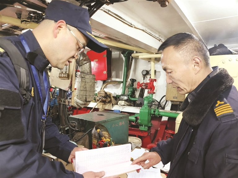 昨天上午9时,舟山海事局执法人员登上靠泊在墩头码头的“金庸5”客船,对该船开展安全检查。驾驶舱内,执法人员对船舶法定文书、通信导航设备以及船舶开航前自查情况进行检查,确保客船落实开航安全“五项制度”;客舱内,对救生设备、消防设备配置安全及有效性进行了检查;机舱内,执法人员还重点检查了轮机日志、车钟记录簿以及航行设备的效能状况和维护情况。