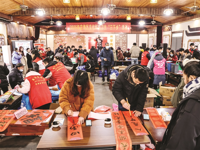 昨天上午,定海区马岙街道马岙村文化礼堂内外人潮涌动,2025年定海区文化科技卫生“三下乡”首站活动在此进行。丰富的服务内容,让冬日的文化礼堂暖意融融。通讯员 姚峰 胡世佳 唐小杰 摄