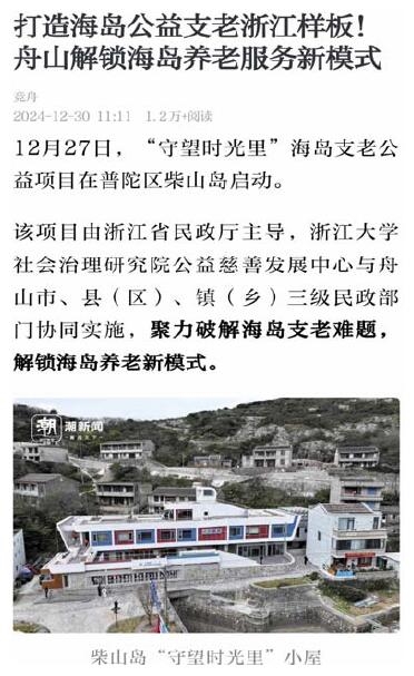 在普陀区的柴山岛,“守望时光里”是由浙江省民政厅主导、多部门协同推进的海岛支老公益项目,聚焦海岛养老难题,创新开启养老新模式,为海岛老人的晚年生活勾勒出新画卷。
