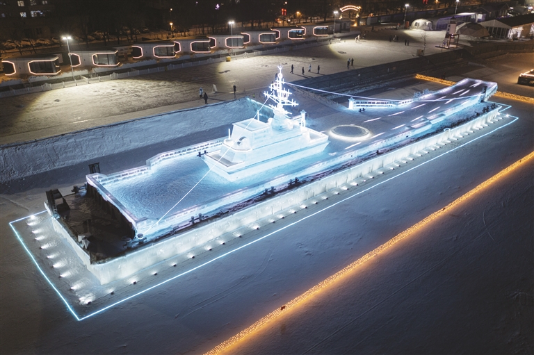 近日,冰建景观“冰雪辽宁舰”在哈尔滨道外区百年航运冰雪欢乐世界园区落成,成为游客新的“网红打卡地”。“冰雪辽宁舰”以我国首艘航空母舰辽宁舰为原型,长65米、宽15米、高13米,以一艘驳船为基底,钢结构焊接为支撑,用冰块搭建出外形,起飞甲板、舰桥等航母的典型特征均得到呈现。