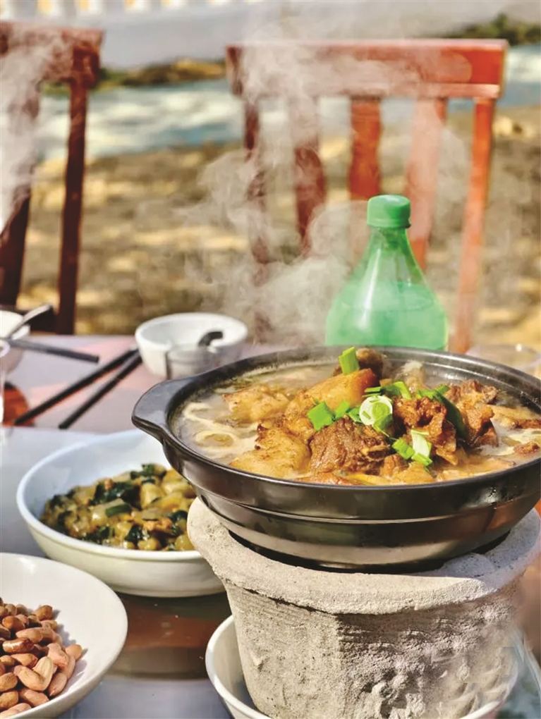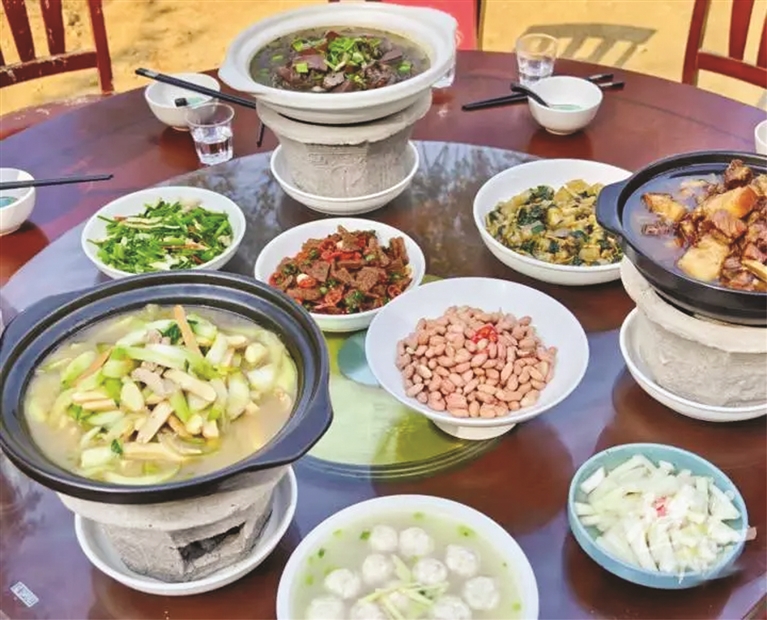 就在程先生忆苦思甜的过程中,猪血暖锅、霜打青菜爆炒肉暖锅、三鲜水肉圆、爆炒猪肝、腊肉四季豆干、农家蕨粉粿、芹菜炒香干、辣椒小炒肉、花生米……相继被端上桌,加入更符合当代人口味的菜品让大家吃得兴致盎然,人们觥筹交错,感受着山乡越来越浓烈的“年味”。