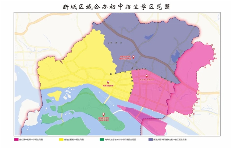 南海实验初中的学区范围调整为:新城千岛路以西、新城大道以南区域(不含长峙岛区域),以及龙湖山庄、贝家塘区域。