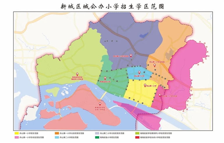(二)舟山第一小学、舟山第一小学北校区、南海实验初中、舟山第一初级中学的招生学区作相应调整。具体如下: