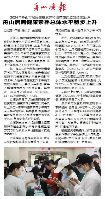 2024年舟山市居民健康素养和烟草使用监测结果于近日出炉:2024年我市居民健康素养水平为40.63%,这意味着每100个舟山居民中,超40个人具备健康素养,比上一年提高了1.16个百分点。