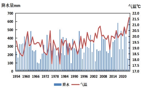 1954~2024年全市秋季平均气温(℃)和累计降水量(毫米)