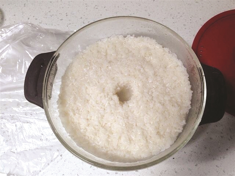 糯米甜酒虽不如白药米酒制作繁琐,但也很有讲究。张素文说,按照老底子方法做的话,需要挑选好颗粒饱满的糯米淘净,倒进木盆里浸泡一夜。第二天清早,将米捞起来沥干,装进煮饭的木桶里,放到有半锅开水的大铁锅里蒸煮。糯米不是一次放入的,不然的话会生熟不匀,需要先放一层糯米,等熟了再加放一层糯米,这样糯米一层又一层直到放满蒸桶为止。待到咕噜咕噜的水泡腾起了氤氲的蒸气,糯米饭的清香充溢了整个厨房才可停火。