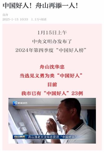 1月15日,中央文明办发布2024年第四季度“中国好人榜”,我市沈华忠当选见义勇为类“中国好人”。