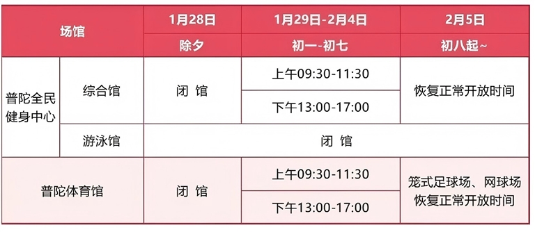 春节期间,暂停晨练场、午间低收费场和晚场。