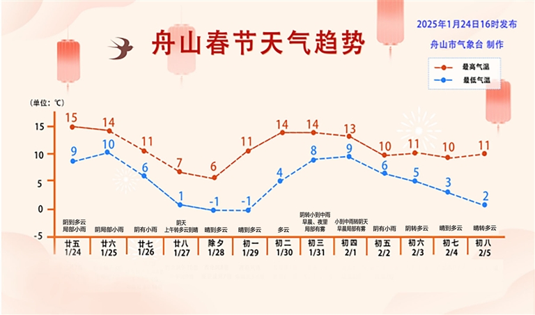 气温方面:26日起强冷空气南下,气温明显下降,25~27日的日平均气温降幅在8~9℃,28日(除夕)和29日(正月初一)早晨最低气温在-1℃左右,有薄冰。29日起气温逐日回升,2月2日前后受另一股冷空气影响开始下降,最低气温在2~3℃。