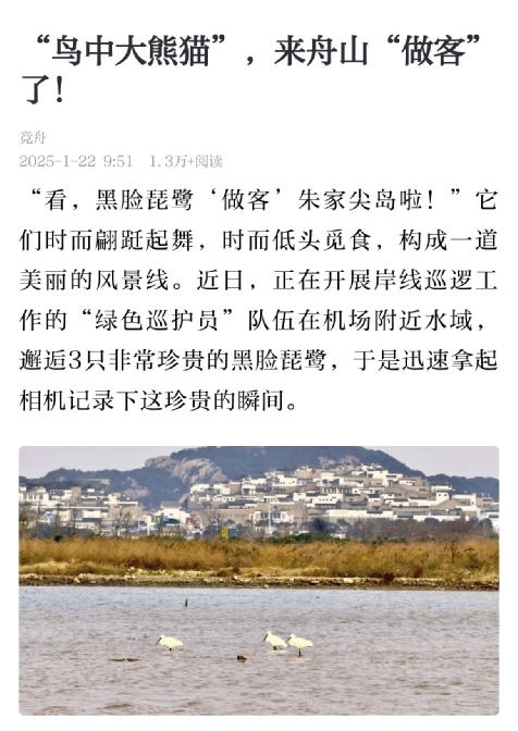 近日,正在开展岸线巡逻的“绿色巡护员”在普陀山机场附近水域,邂逅3只黑脸琵鹭。黑脸琵鹭是国家一级保护野生动物,2024年全球黑脸琵鹭共记录不到7000只,被誉为“鸟中大熊猫”(《舟山晚报》1月23日报道)。“鸟中大熊猫”出现在朱家尖岛,实在是给美丽舟山增光添彩。