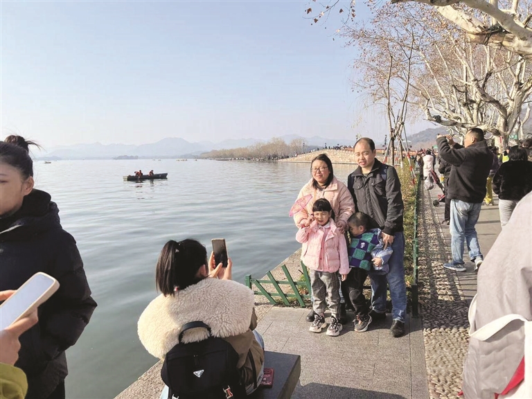 不远处,来自河北邯郸的一对情侣也忙着拍照打卡。断桥,是他们春节来杭州旅游的第一站,因为“这是个浪漫的地方”。