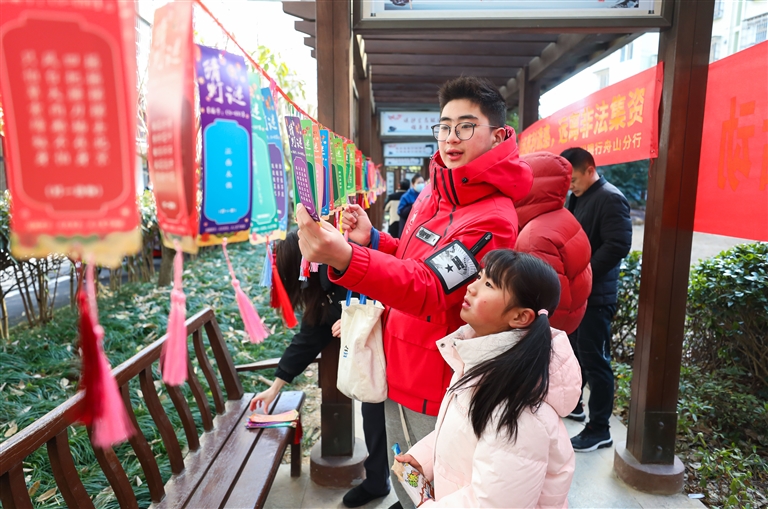2月8日,定海昌国街道合源新村,居民们正在小区公园里兴致勃勃地猜灯谜迎元宵 记者 张磊 通讯员 刘英 摄