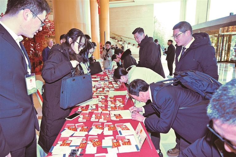 市人大代表白霓衣身着白色职业套装,精神抖擞来到报到现场。完成报到流程后,她迫不及待地拿出一份独特的文创产品,向其他市人大代表展示。