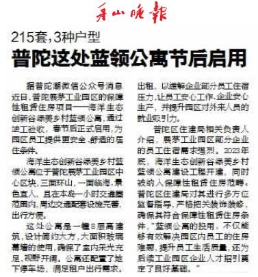 近日,普陀展茅工业园区的保障性租赁住房项目——海洋生态创新谷绿美乡村蓝领公寓通过竣工验收,春节后正式启用(《舟山晚报》2月6日报道)。安居才能乐业,这样的蓝领公寓有益于筑巢引凤,为企业引人留人创造良好条件。