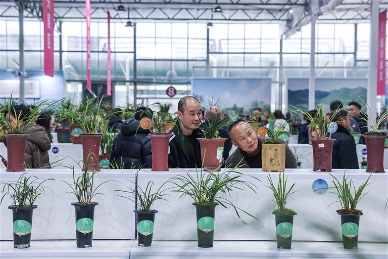 2月14日,观众在中国春兰大集上欣赏兰花。