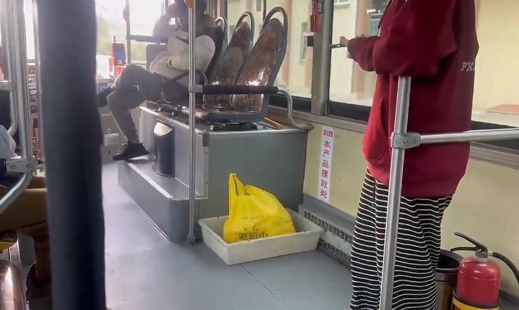 这样一个自发的好点子得到了公交公司的肯定和支持,统一给经过水产城一带的公交线路都配了一个塑料筐,尺寸更大也更能装,还划分出了专门的车厢位置,设置温馨提醒告知乘客。