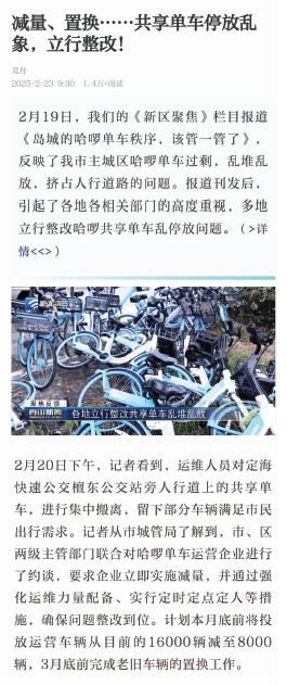 “岛城的哈啰单车秩序,该管一管了”(2月19日舟山日报报道),反映我市主城区哈啰单车过剩、乱堆乱放、挤占人行道的问题。报道刊发后,引起了各地各相关部门的高度重视,多地立行整改哈啰共享单车乱停放问题。