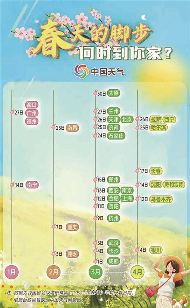 中国天气网统计1991年至2020年的入季大数据发现,大城市中,最早入春的南宁,一般1月14日就会迈入春天的门槛,最晚盼到春暖的西宁和拉萨,则要等到4月26日,一南一北入春时间相隔102天。