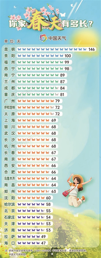 大城市中,北京、石家庄、天津、济南的春天普遍只有53至55天,显得格外珍贵。